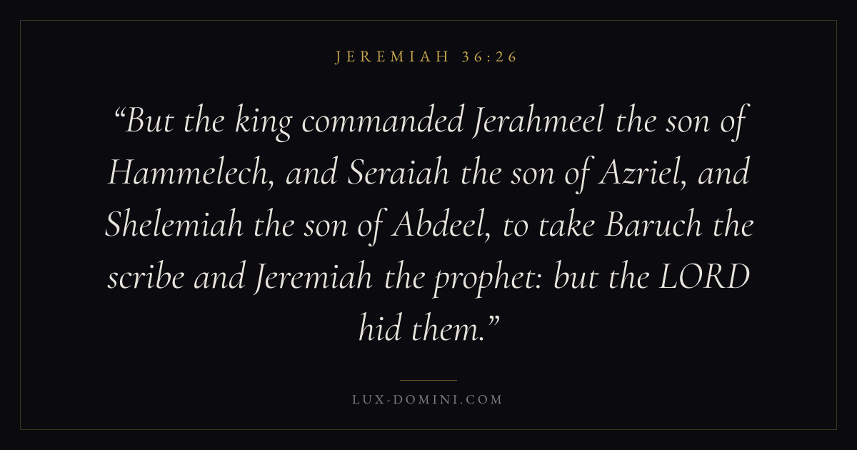 But the king commanded Jerahmeel the son of Hammelech, and Seraiah the son of Azriel, and Shelemiah the son of Abdeel, to take Baruch the scribe and Jeremiah the prophet: but the LORD hid them.