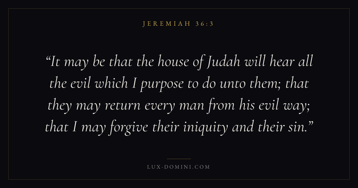 It may be that the house of Judah will hear all the evil which I purpose to do unto them; that they may return every man from his evil way; that I may forgive their iniquity and their sin.
