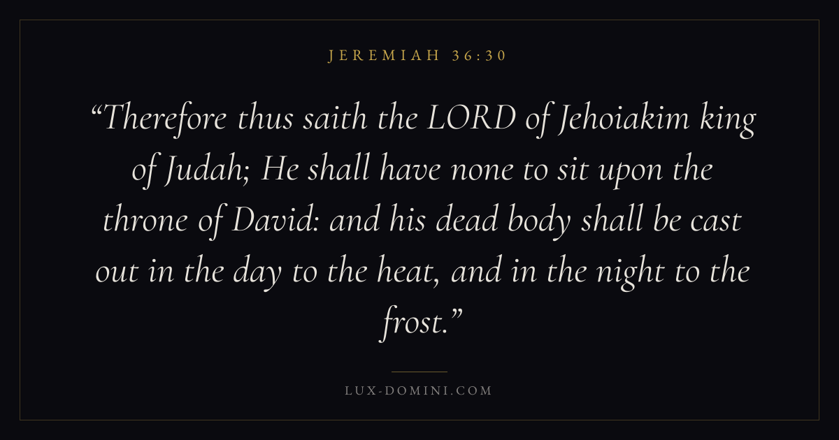 Therefore thus saith the LORD of Jehoiakim king of Judah; He shall have none to sit upon the throne of David: and his dead body shall be cast out in the day to the heat, and in the night to the frost.