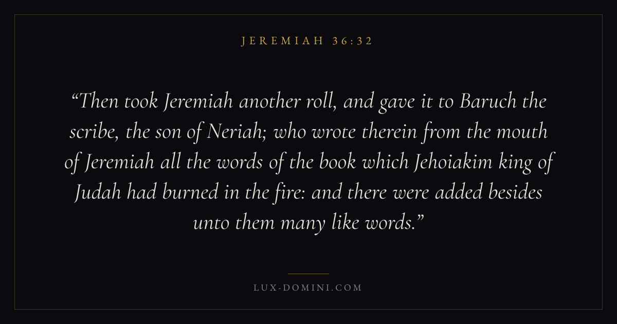 Then took Jeremiah another roll, and gave it to Baruch the scribe, the son of Neriah; who wrote therein from the mouth of Jeremiah all the words of the book which Jehoiakim king of Judah had burned in the fire: and there were added besides unto them many like words.