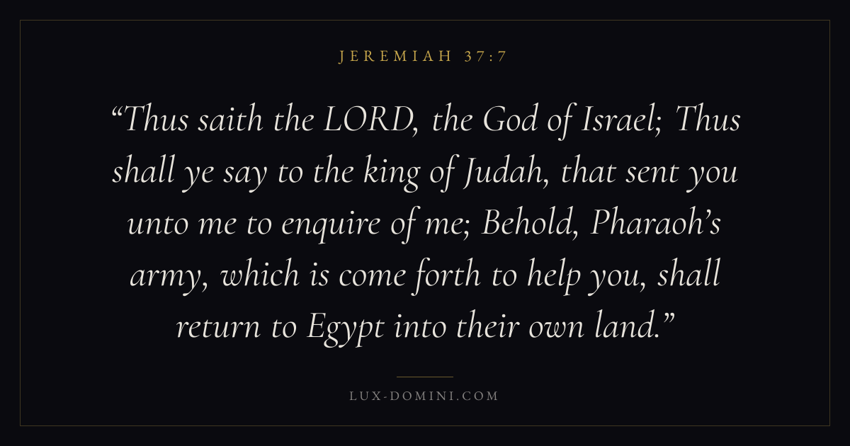 Thus saith the LORD, the God of Israel; Thus shall ye say to the king of Judah, that sent you unto me to enquire of me; Behold, Pharaoh’s army, which is come forth to help you, shall return to Egypt into their own land.