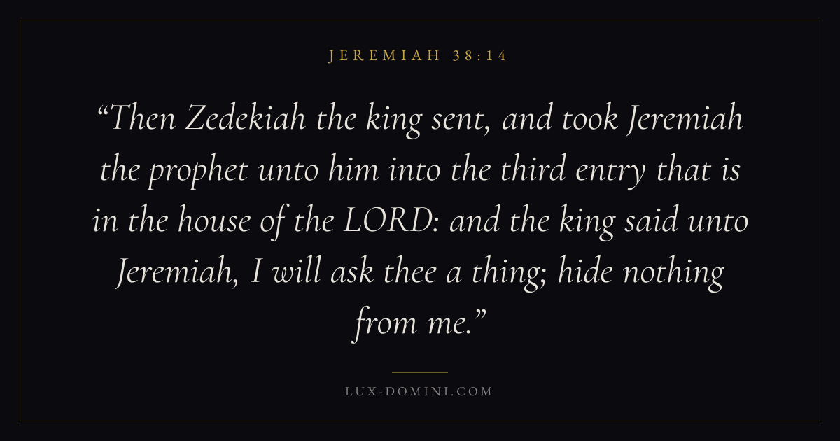 Then Zedekiah the king sent, and took Jeremiah the prophet unto him into the third entry that is in the house of the LORD: and the king said unto Jeremiah, I will ask thee a thing; hide nothing from me.