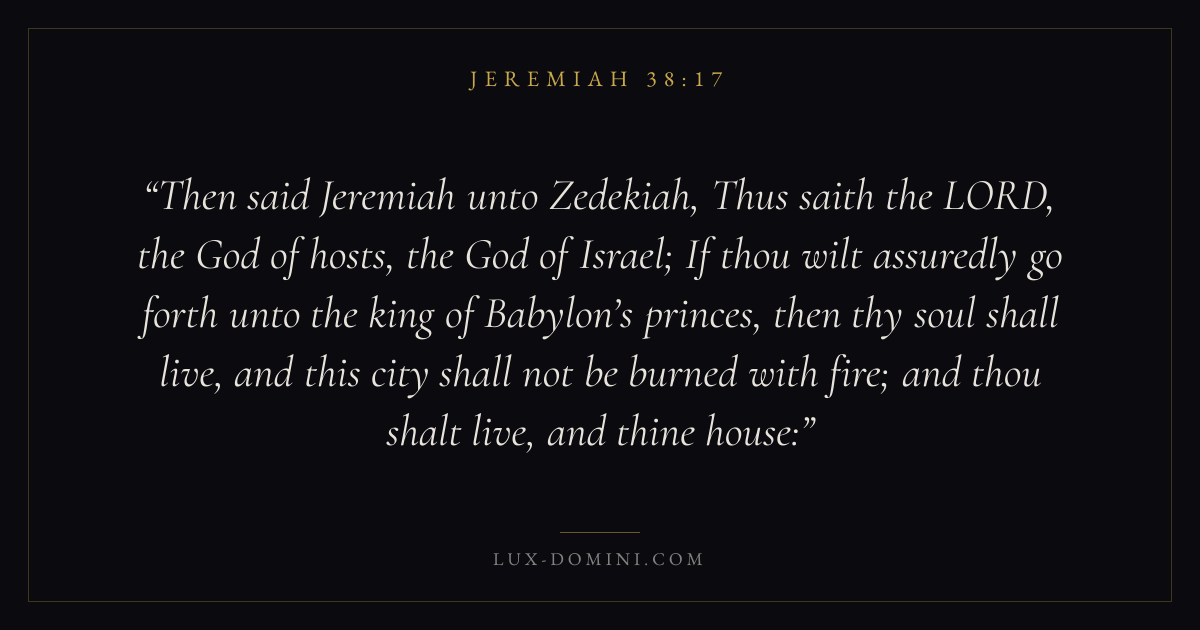 Then said Jeremiah unto Zedekiah, Thus saith the LORD, the God of hosts, the God of Israel; If thou wilt assuredly go forth unto the king of Babylon’s princes, then thy soul shall live, and this city shall not be burned with fire; and thou shalt live, and thine house: