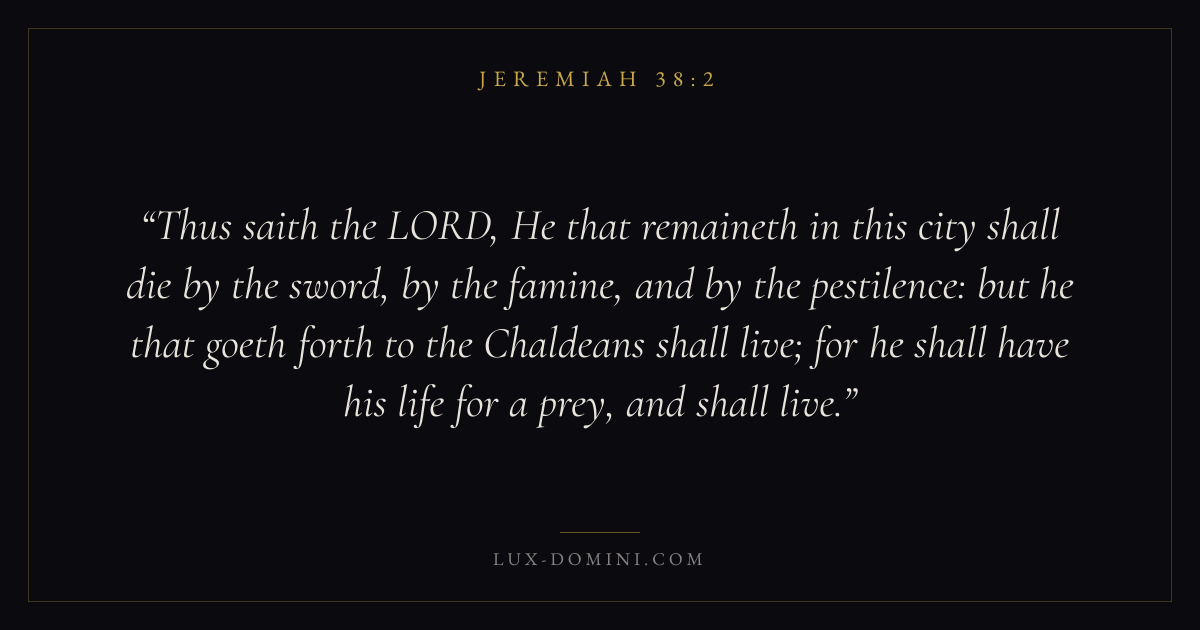 Thus saith the LORD, He that remaineth in this city shall die by the sword, by the famine, and by the pestilence: but he that goeth forth to the Chaldeans shall live; for he shall have his life for a prey, and shall live.