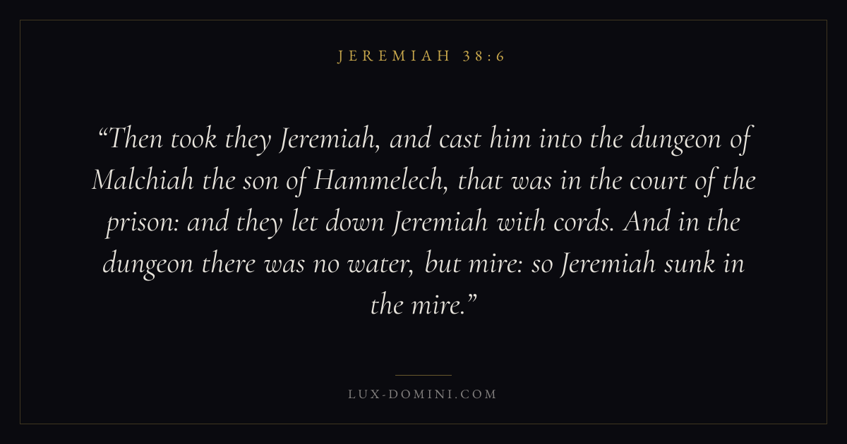 Then took they Jeremiah, and cast him into the dungeon of Malchiah the son of Hammelech, that was in the court of the prison: and they let down Jeremiah with cords. And in the dungeon there was no water, but mire: so Jeremiah sunk in the mire.