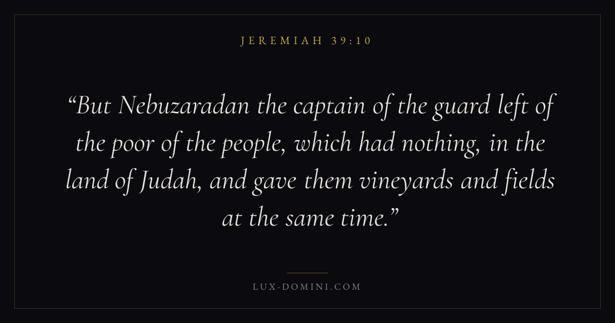 But Nebuzaradan the captain of the guard left of the poor of the people, which had nothing, in the land of Judah, and gave them vineyards and fields at the same time.
