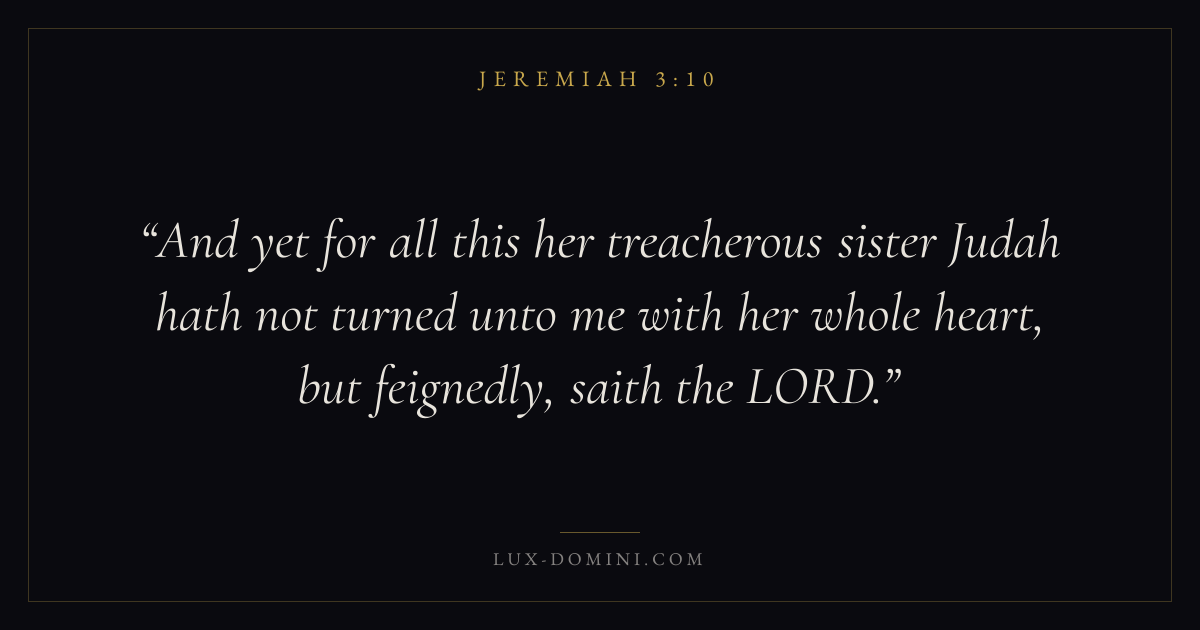 And yet for all this her treacherous sister Judah hath not turned unto me with her whole heart, but feignedly, saith the LORD.