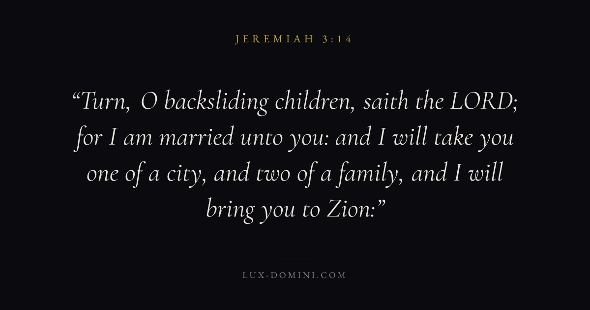 Turn, O backsliding children, saith the LORD; for I am married unto you: and I will take you one of a city, and two of a family, and I will bring you to Zion: