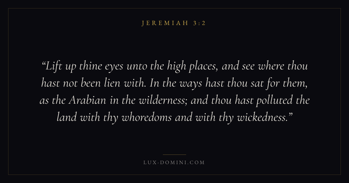 Lift up thine eyes unto the high places, and see where thou hast not been lien with. In the ways hast thou sat for them, as the Arabian in the wilderness; and thou hast polluted the land with thy whoredoms and with thy wickedness.