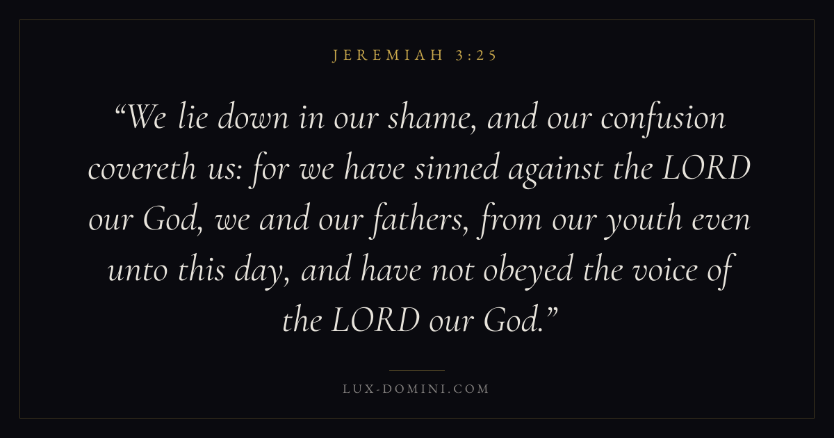 We lie down in our shame, and our confusion covereth us: for we have sinned against the LORD our God, we and our fathers, from our youth even unto this day, and have not obeyed the voice of the LORD our God.