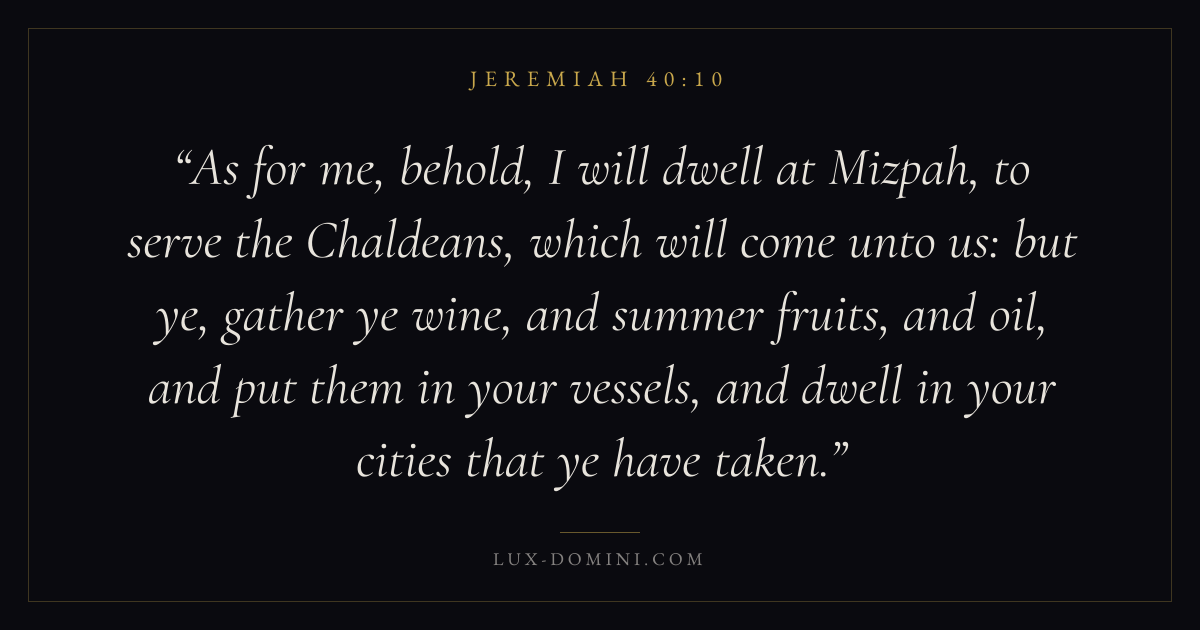 As for me, behold, I will dwell at Mizpah, to serve the Chaldeans, which will come unto us: but ye, gather ye wine, and summer fruits, and oil, and put them in your vessels, and dwell in your cities that ye have taken.