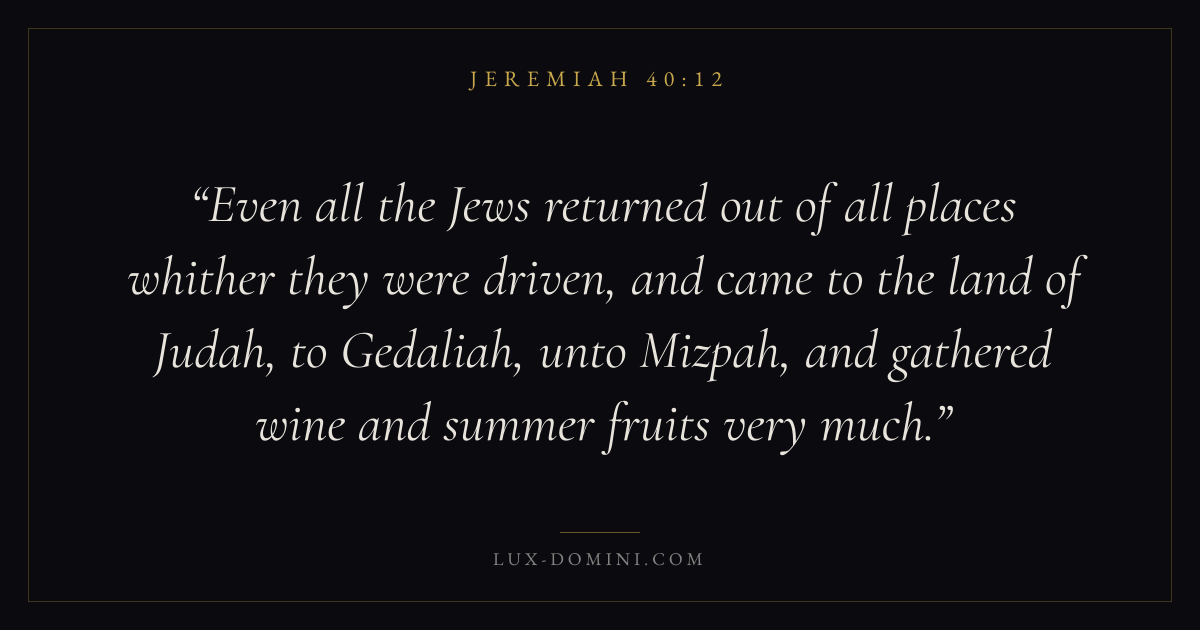 Even all the Jews returned out of all places whither they were driven, and came to the land of Judah, to Gedaliah, unto Mizpah, and gathered wine and summer fruits very much.