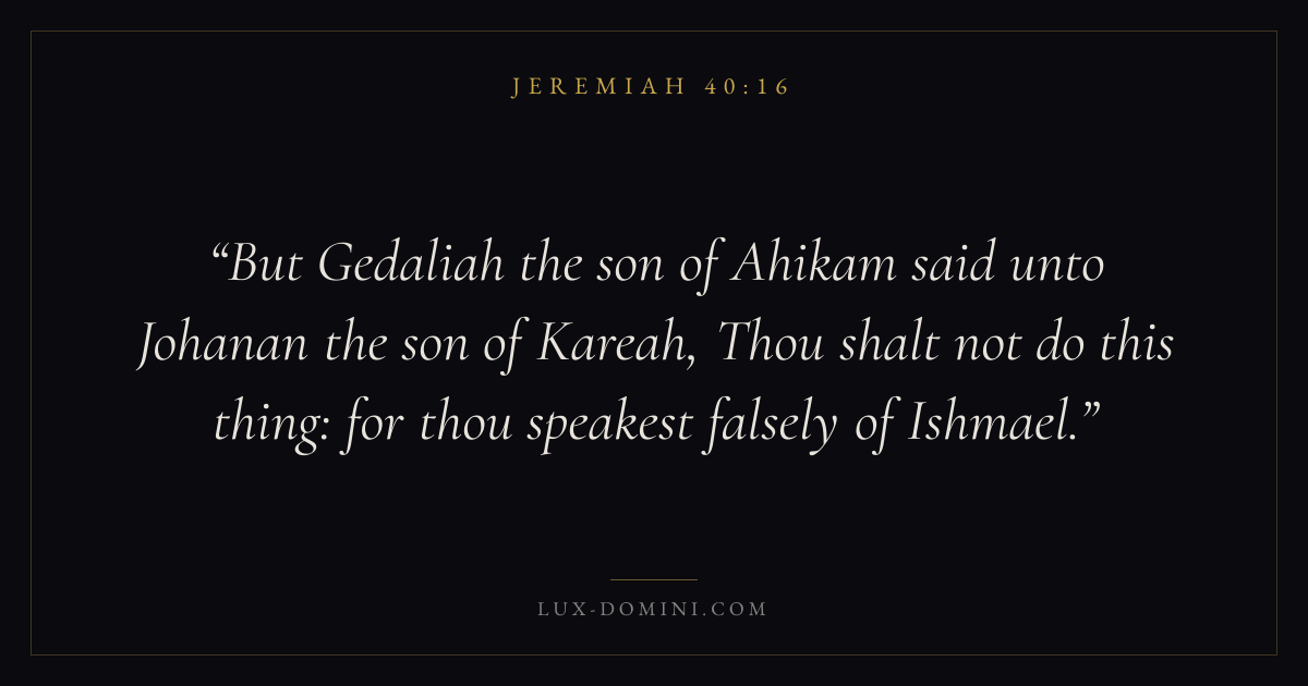But Gedaliah the son of Ahikam said unto Johanan the son of Kareah, Thou shalt not do this thing: for thou speakest falsely of Ishmael.