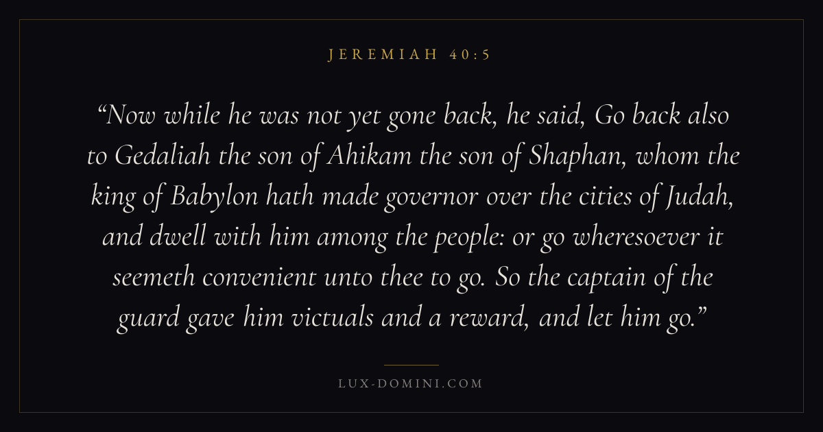 Now while he was not yet gone back, he said, Go back also to Gedaliah the son of Ahikam the son of Shaphan, whom the king of Babylon hath made governor over the cities of Judah, and dwell with him among the people: or go wheresoever it seemeth convenient unto thee to go. So the captain of the guard gave him victuals and a reward, and let him go.