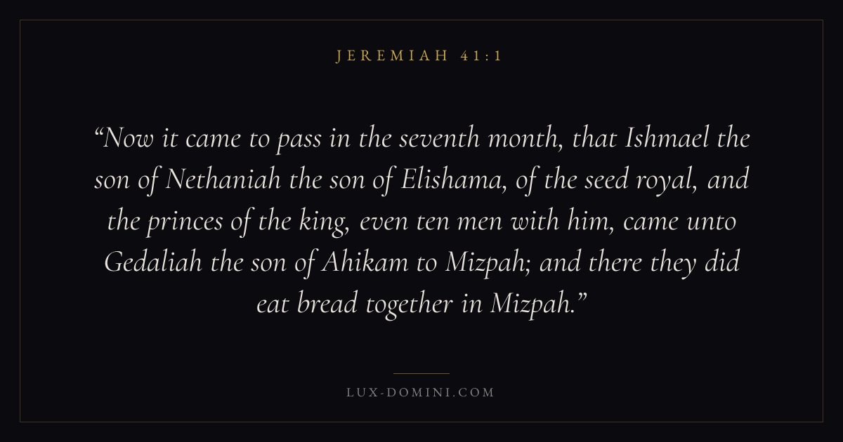 Now it came to pass in the seventh month, that Ishmael the son of Nethaniah the son of Elishama, of the seed royal, and the princes of the king, even ten men with him, came unto Gedaliah the son of Ahikam to Mizpah; and there they did eat bread together in Mizpah.