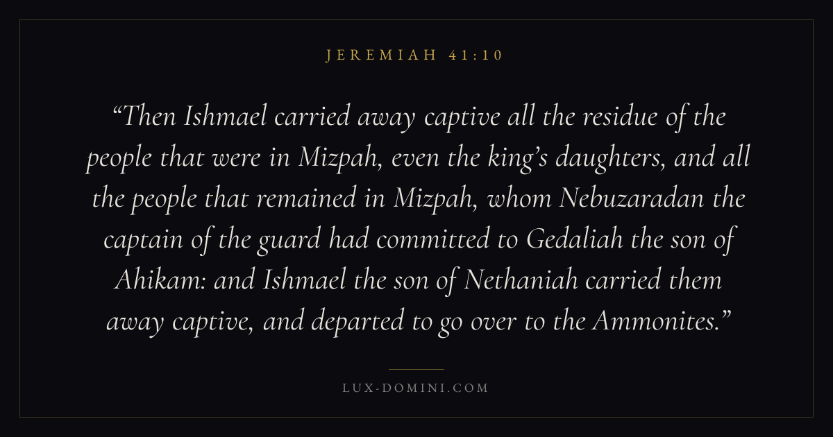 Then Ishmael carried away captive all the residue of the people that were in Mizpah, even the king’s daughters, and all the people that remained in Mizpah, whom Nebuzaradan the captain of the guard had committed to Gedaliah the son of Ahikam: and Ishmael the son of Nethaniah carried them away captive, and departed to go over to the Ammonites.