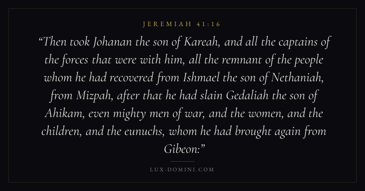 Then took Johanan the son of Kareah, and all the captains of the forces that were with him, all the remnant of the people whom he had recovered from Ishmael the son of Nethaniah, from Mizpah, after that he had slain Gedaliah the son of Ahikam, even mighty men of war, and the women, and the children, and the eunuchs, whom he had brought again from Gibeon: