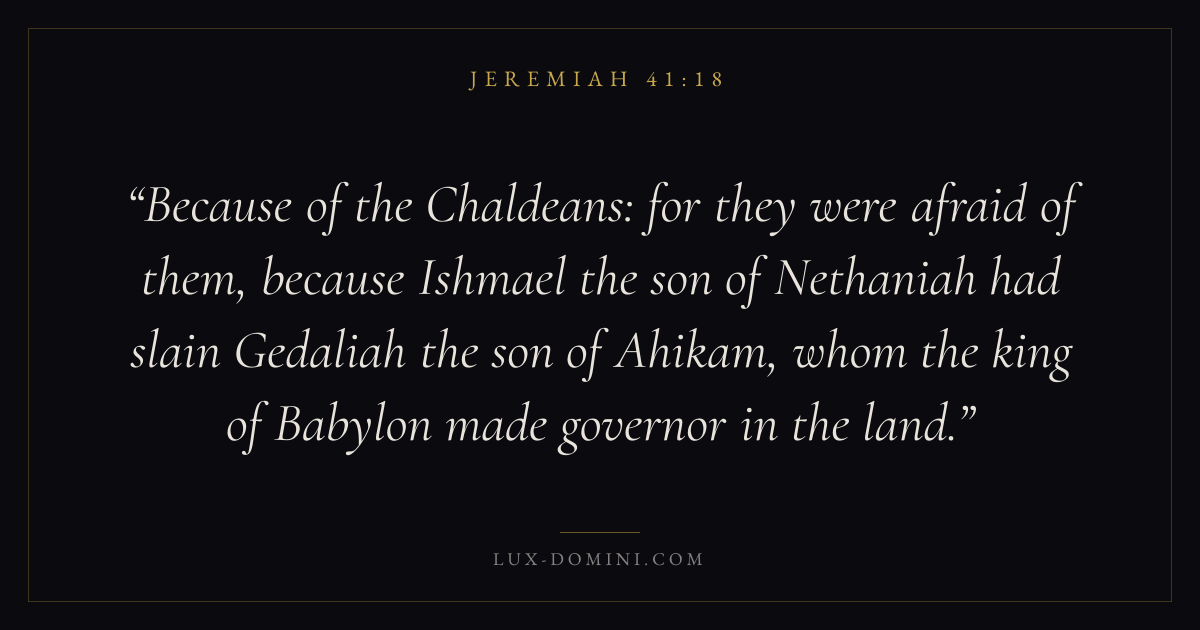 Because of the Chaldeans: for they were afraid of them, because Ishmael the son of Nethaniah had slain Gedaliah the son of Ahikam, whom the king of Babylon made governor in the land.