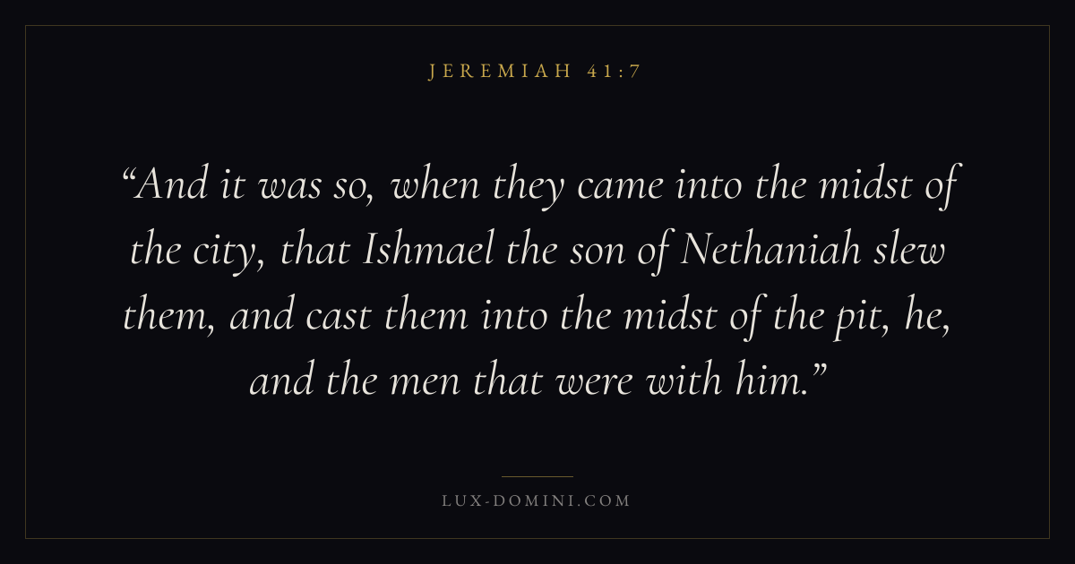 And it was so, when they came into the midst of the city, that Ishmael the son of Nethaniah slew them, and cast them into the midst of the pit, he, and the men that were with him.