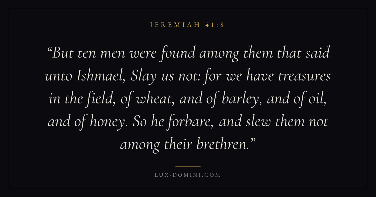 But ten men were found among them that said unto Ishmael, Slay us not: for we have treasures in the field, of wheat, and of barley, and of oil, and of honey. So he forbare, and slew them not among their brethren.