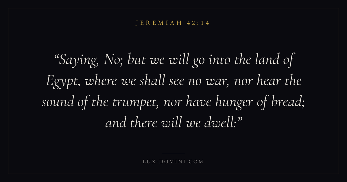 Saying, No; but we will go into the land of Egypt, where we shall see no war, nor hear the sound of the trumpet, nor have hunger of bread; and there will we dwell: