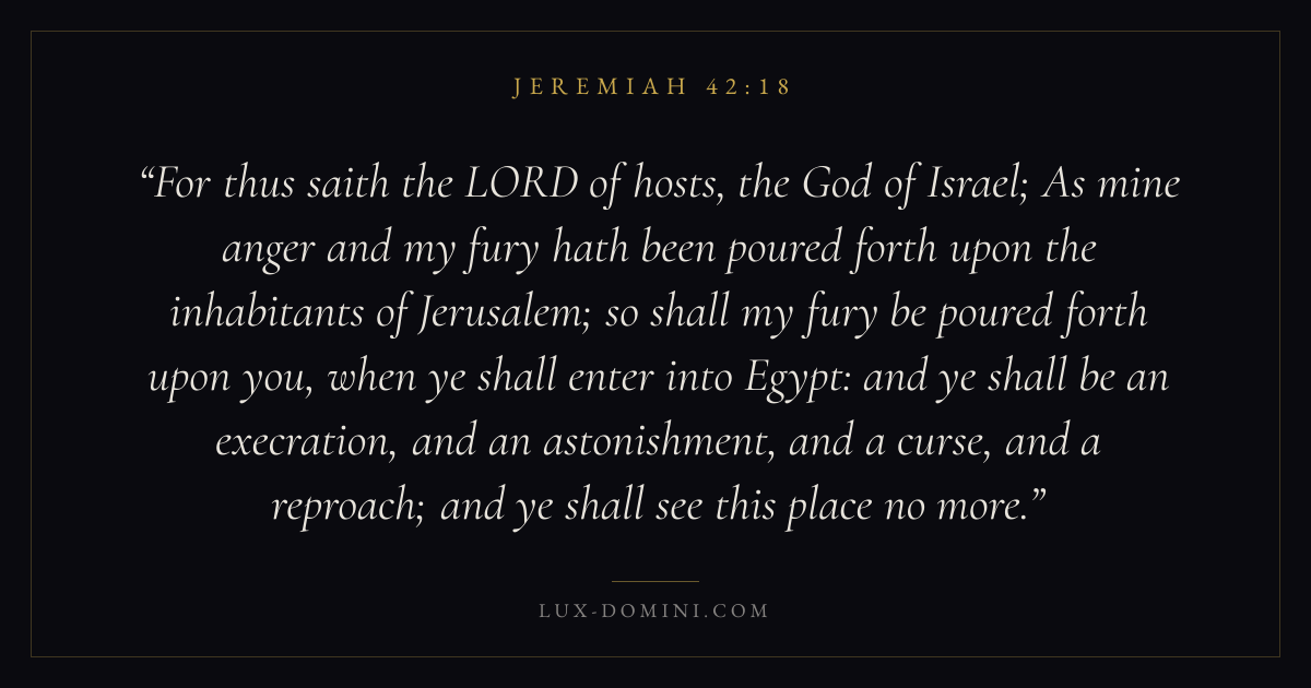 For thus saith the LORD of hosts, the God of Israel; As mine anger and my fury hath been poured forth upon the inhabitants of Jerusalem; so shall my fury be poured forth upon you, when ye shall enter into Egypt: and ye shall be an execration, and an astonishment, and a curse, and a reproach; and ye shall see this place no more.