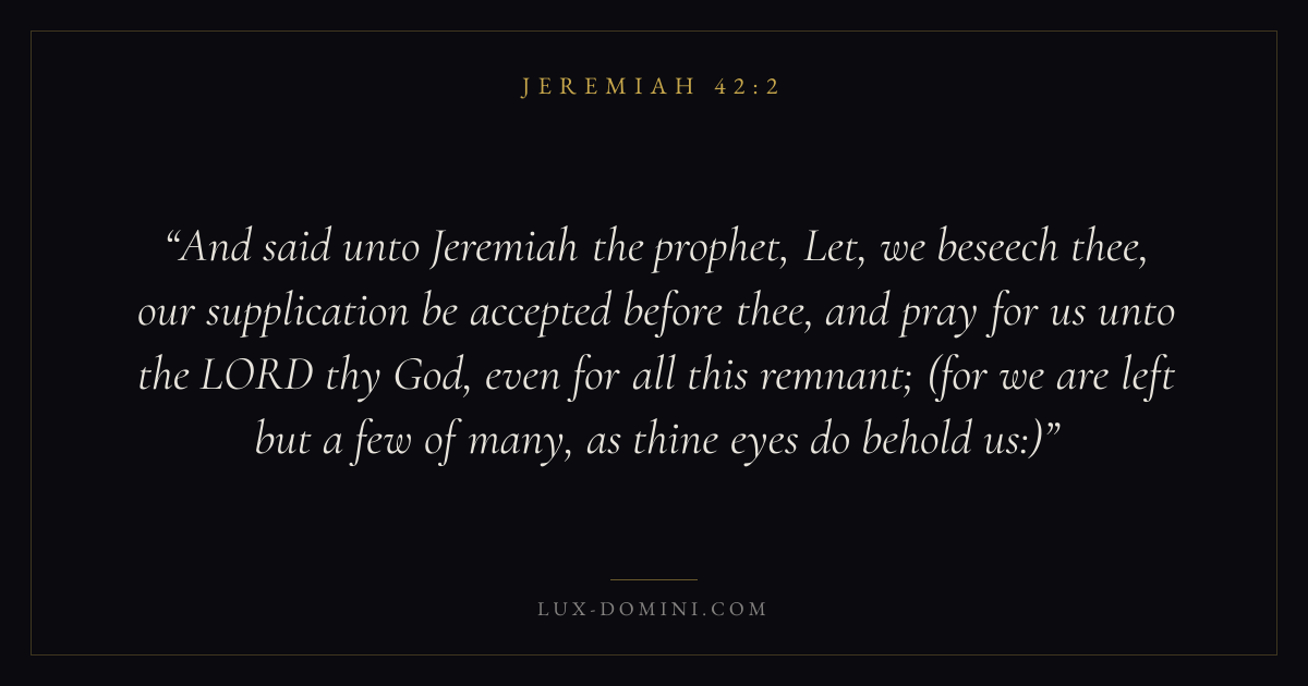 And said unto Jeremiah the prophet, Let, we beseech thee, our supplication be accepted before thee, and pray for us unto the LORD thy God, even for all this remnant; (for we are left but a few of many, as thine eyes do behold us:)
