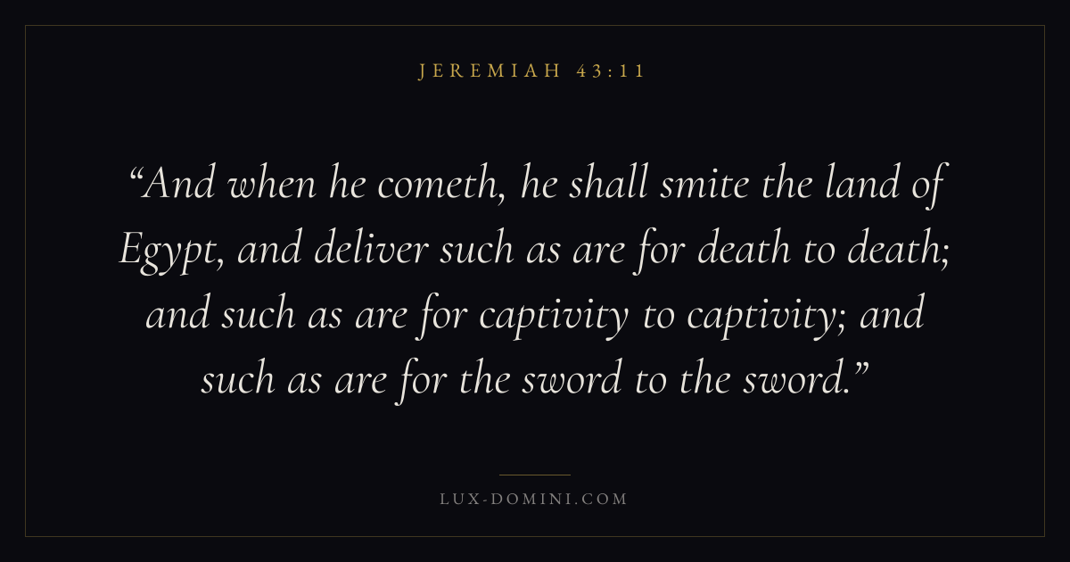 And when he cometh, he shall smite the land of Egypt, and deliver such as are for death to death; and such as are for captivity to captivity; and such as are for the sword to the sword.