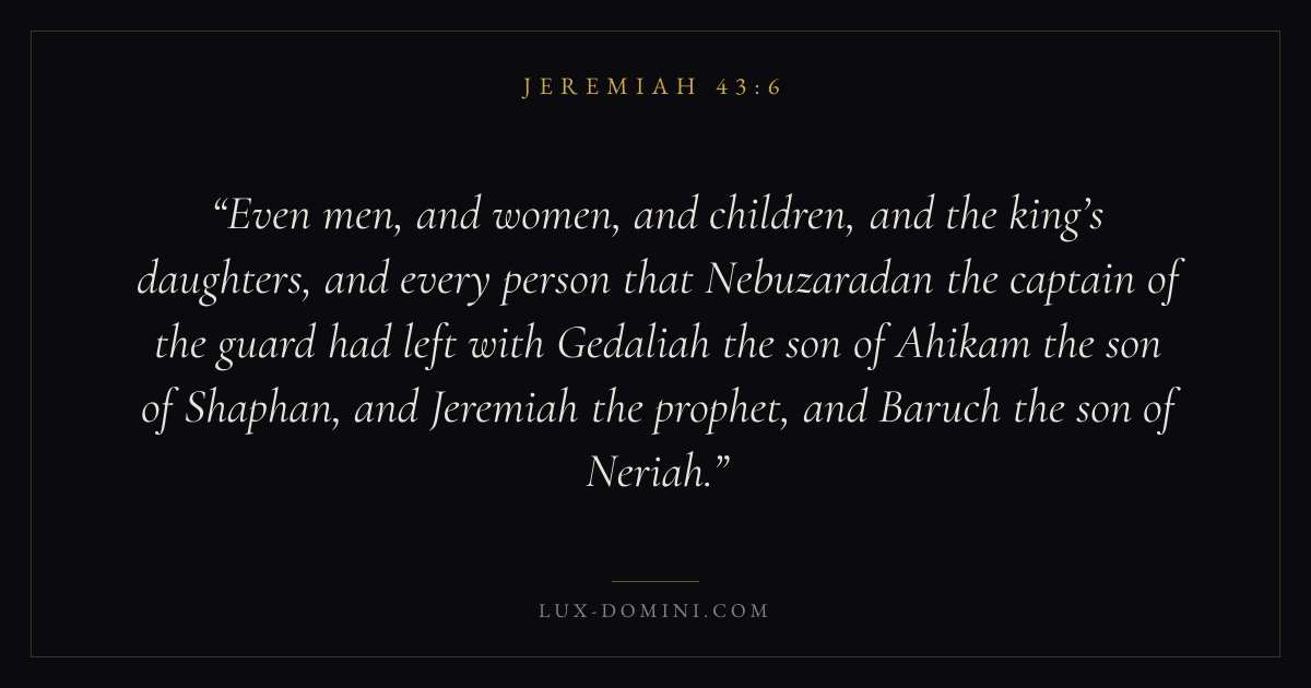 Even men, and women, and children, and the king’s daughters, and every person that Nebuzaradan the captain of the guard had left with Gedaliah the son of Ahikam the son of Shaphan, and Jeremiah the prophet, and Baruch the son of Neriah.