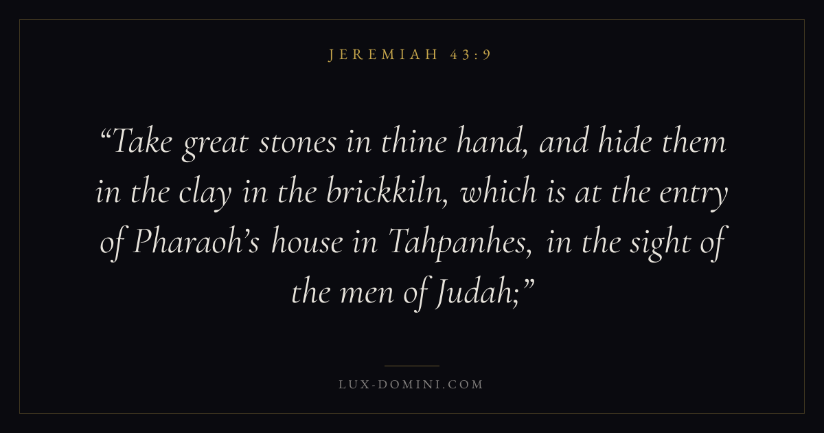 Take great stones in thine hand, and hide them in the clay in the brickkiln, which is at the entry of Pharaoh’s house in Tahpanhes, in the sight of the men of Judah;