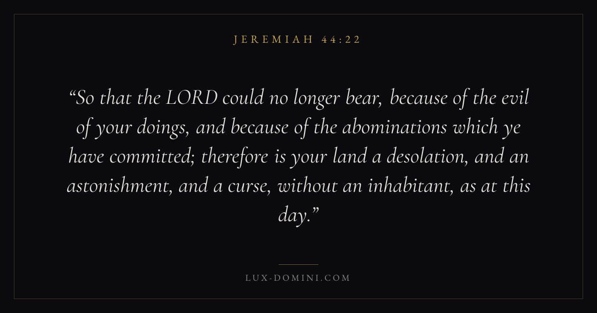 So that the LORD could no longer bear, because of the evil of your doings, and because of the abominations which ye have committed; therefore is your land a desolation, and an astonishment, and a curse, without an inhabitant, as at this day.