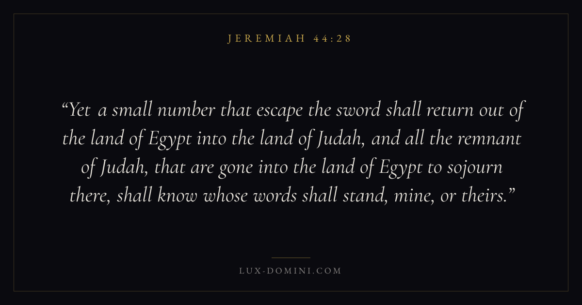 Yet a small number that escape the sword shall return out of the land of Egypt into the land of Judah, and all the remnant of Judah, that are gone into the land of Egypt to sojourn there, shall know whose words shall stand, mine, or theirs.