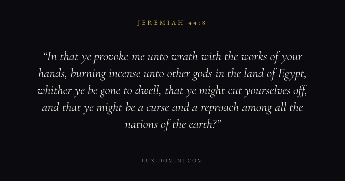 In that ye provoke me unto wrath with the works of your hands, burning incense unto other gods in the land of Egypt, whither ye be gone to dwell, that ye might cut yourselves off, and that ye might be a curse and a reproach among all the nations of the earth?