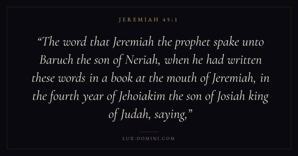 The word that Jeremiah the prophet spake unto Baruch the son of Neriah, when he had written these words in a book at the mouth of Jeremiah, in the fourth year of Jehoiakim the son of Josiah king of Judah, saying,