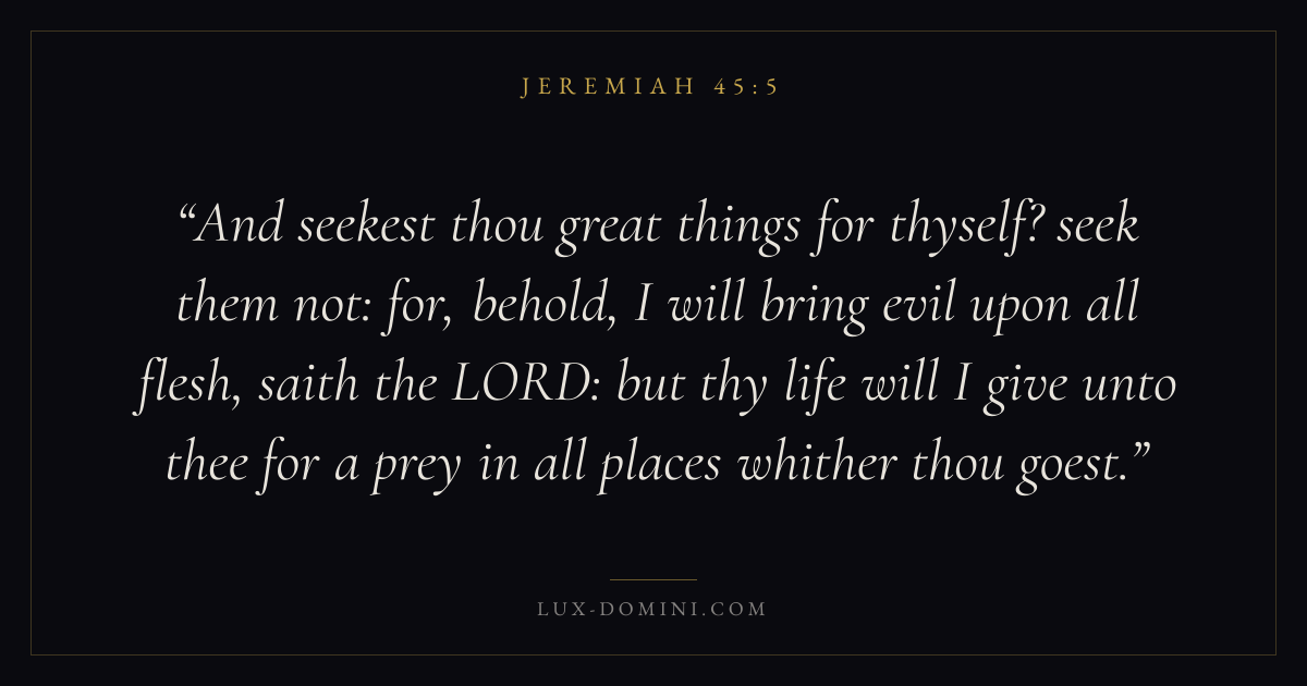And seekest thou great things for thyself? seek them not: for, behold, I will bring evil upon all flesh, saith the LORD: but thy life will I give unto thee for a prey in all places whither thou goest.