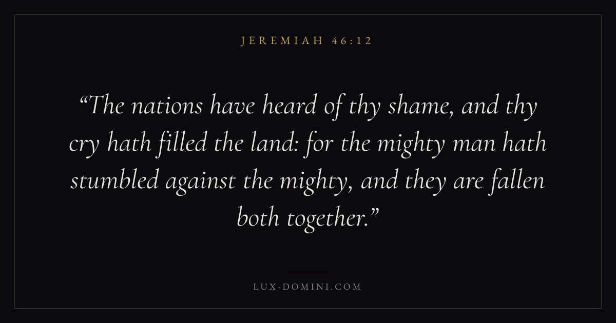 The nations have heard of thy shame, and thy cry hath filled the land: for the mighty man hath stumbled against the mighty, and they are fallen both together.
