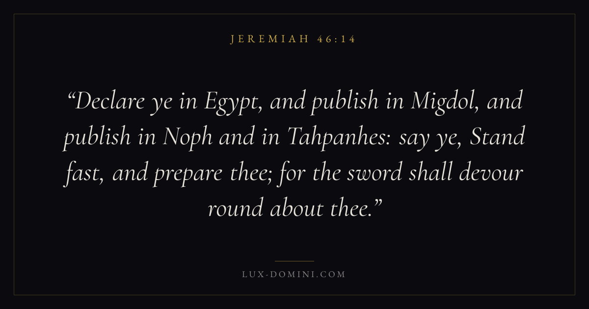 Declare ye in Egypt, and publish in Migdol, and publish in Noph and in Tahpanhes: say ye, Stand fast, and prepare thee; for the sword shall devour round about thee.