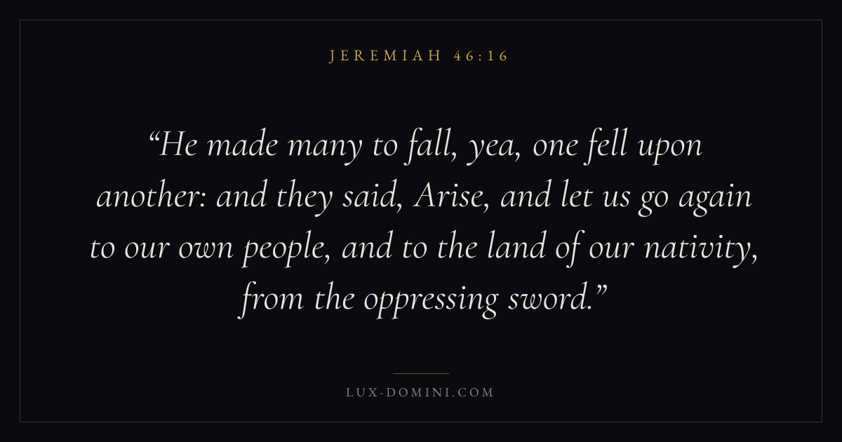 He made many to fall, yea, one fell upon another: and they said, Arise, and let us go again to our own people, and to the land of our nativity, from the oppressing sword.