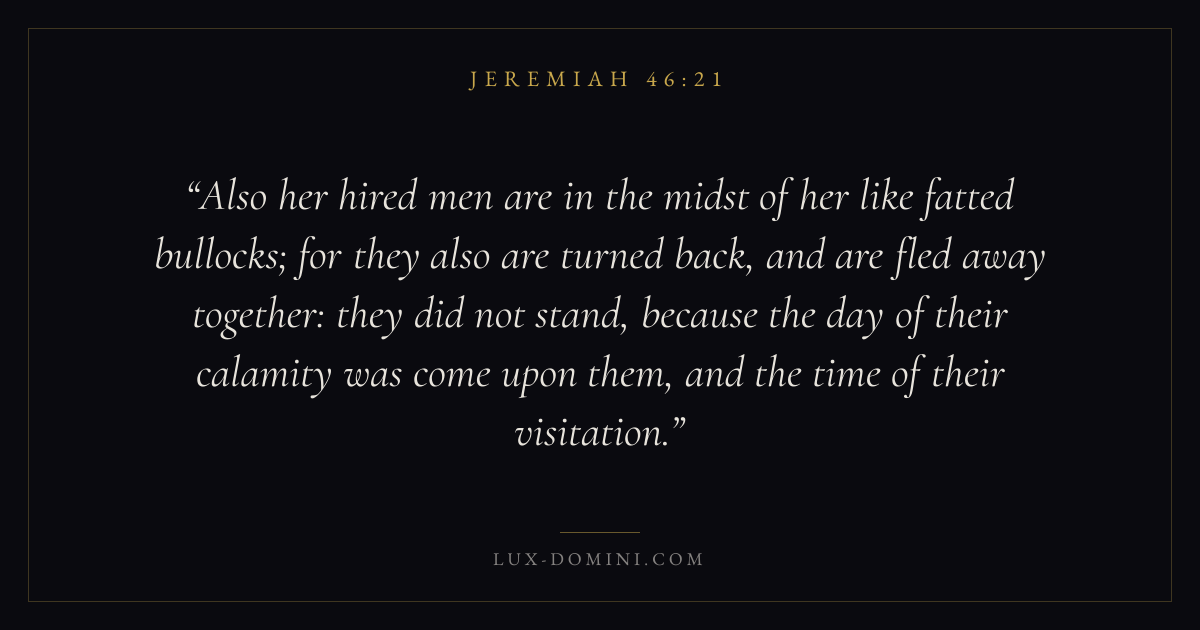 Also her hired men are in the midst of her like fatted bullocks; for they also are turned back, and are fled away together: they did not stand, because the day of their calamity was come upon them, and the time of their visitation.