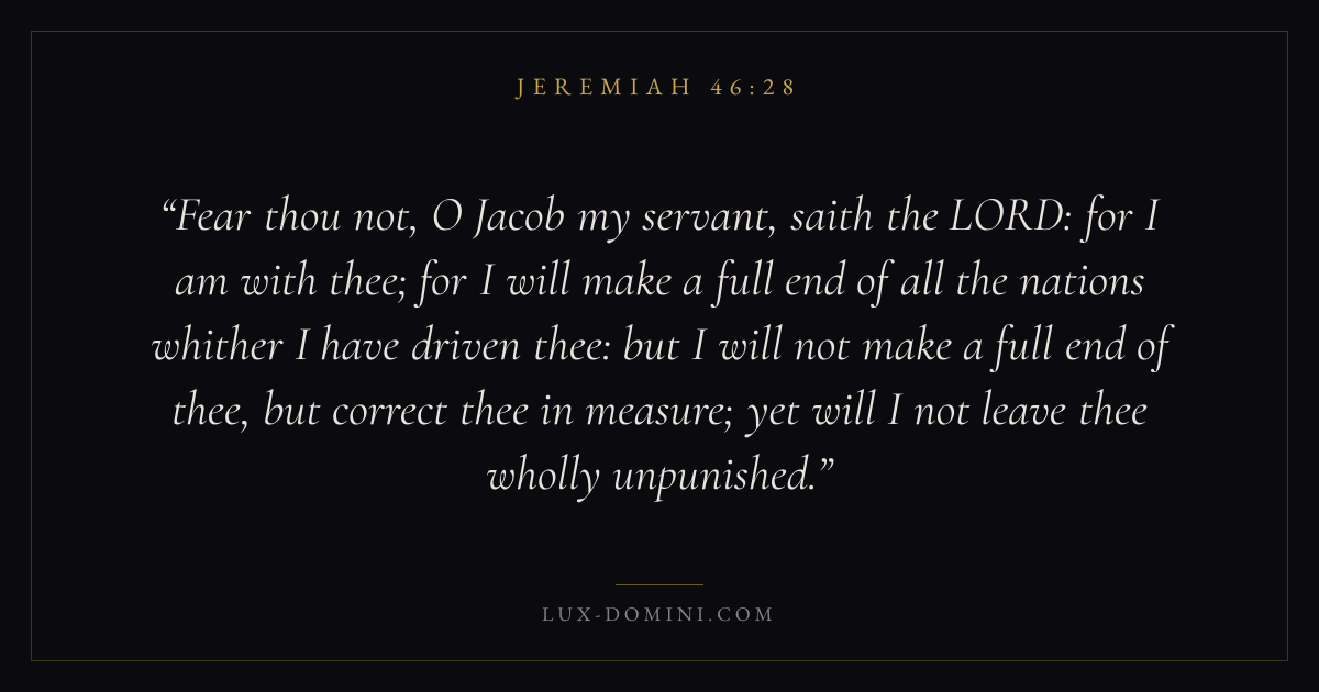 Fear thou not, O Jacob my servant, saith the LORD: for I am with thee; for I will make a full end of all the nations whither I have driven thee: but I will not make a full end of thee, but correct thee in measure; yet will I not leave thee wholly unpunished.