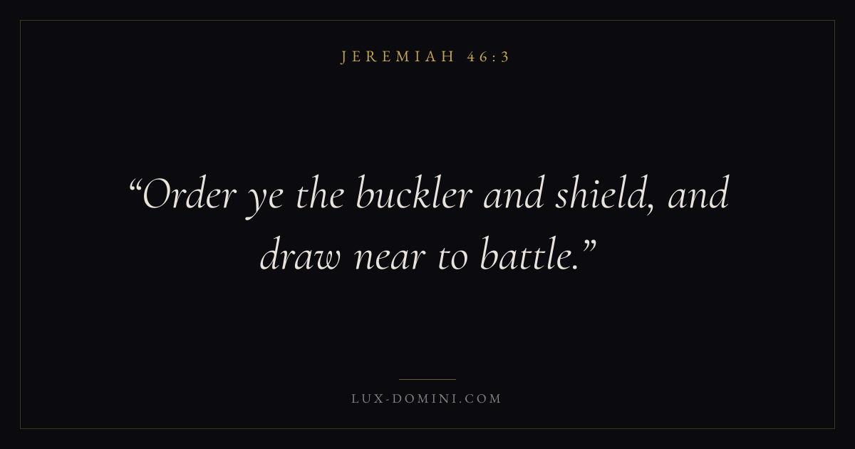 Books / Jeremiah / Chapter 46 / Verse 3 ← Jeremiah 46:2 Jeremiah 46:3 Jeremiah 46:4 → Order ye the buckler and shield, and draw near to battle. Download verse card Share on Twitter Share on Facebook Pin it ✦ Key themes HopeSuffering and trialsJustice and mercyTruthJudgment Read with Jeremiah 46:1Jeremiah 46:2Romans 8:24Revelation 21:4 Related topics Bible verses about hopeBible verses about suffering and trialsBible verses about justice and mercyBible verses about truth ✦ Jeremiah Chapter 46 verses V. 1 V. 2 V. 3 V. 4 V. 5 V. 6 V. 7 V. 8 V. 9 V. 10 V. 11 V. 12 V. 13 V. 14 V. 15 V. 16 V. 17 V. 18 V. 19 V. 20 V. 21 V. 22 V. 23 V. 24 V. 25 V. 26 V. 27 V. 28