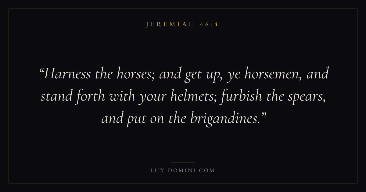 Harness the horses; and get up, ye horsemen, and stand forth with your helmets; furbish the spears, and put on the brigandines.