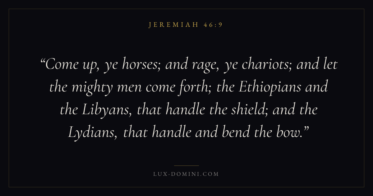 Come up, ye horses; and rage, ye chariots; and let the mighty men come forth; the Ethiopians and the Libyans, that handle the shield; and the Lydians, that handle and bend the bow.