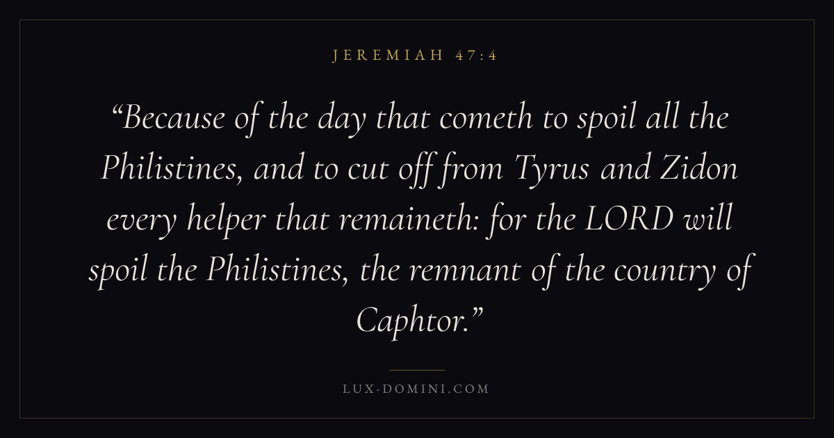 Because of the day that cometh to spoil all the Philistines, and to cut off from Tyrus and Zidon every helper that remaineth: for the LORD will spoil the Philistines, the remnant of the country of Caphtor.