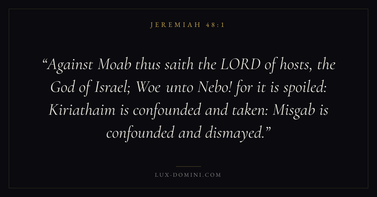 Against Moab thus saith the LORD of hosts, the God of Israel; Woe unto Nebo! for it is spoiled: Kiriathaim is confounded and taken: Misgab is confounded and dismayed.