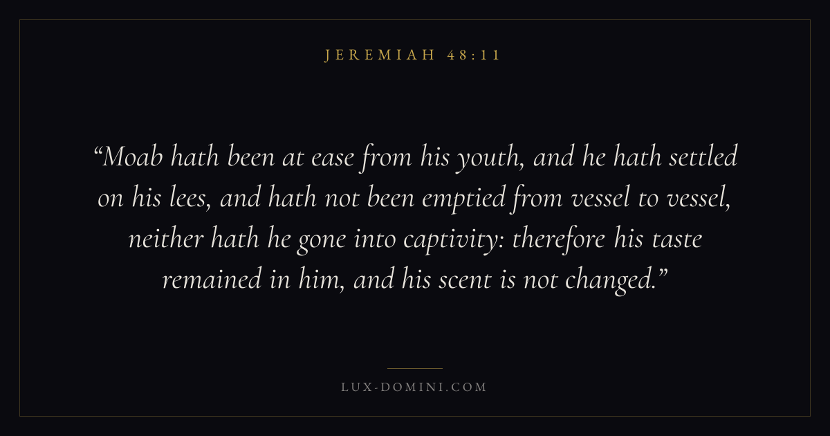 Moab hath been at ease from his youth, and he hath settled on his lees, and hath not been emptied from vessel to vessel, neither hath he gone into captivity: therefore his taste remained in him, and his scent is not changed.