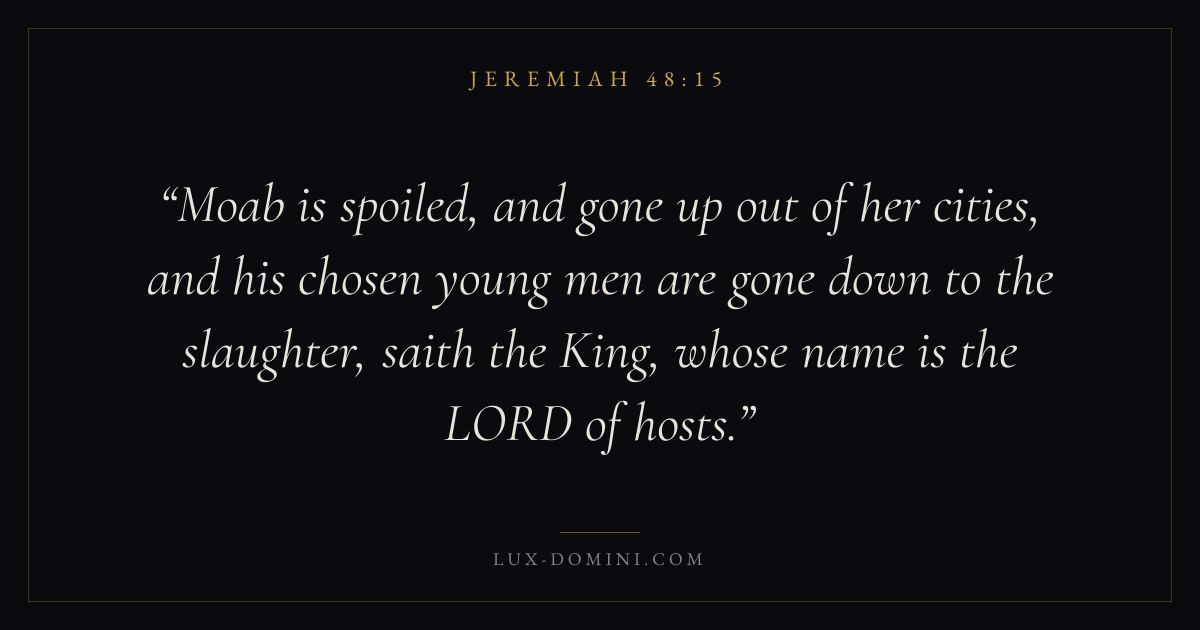 Moab is spoiled, and gone up out of her cities, and his chosen young men are gone down to the slaughter, saith the King, whose name is the LORD of hosts.