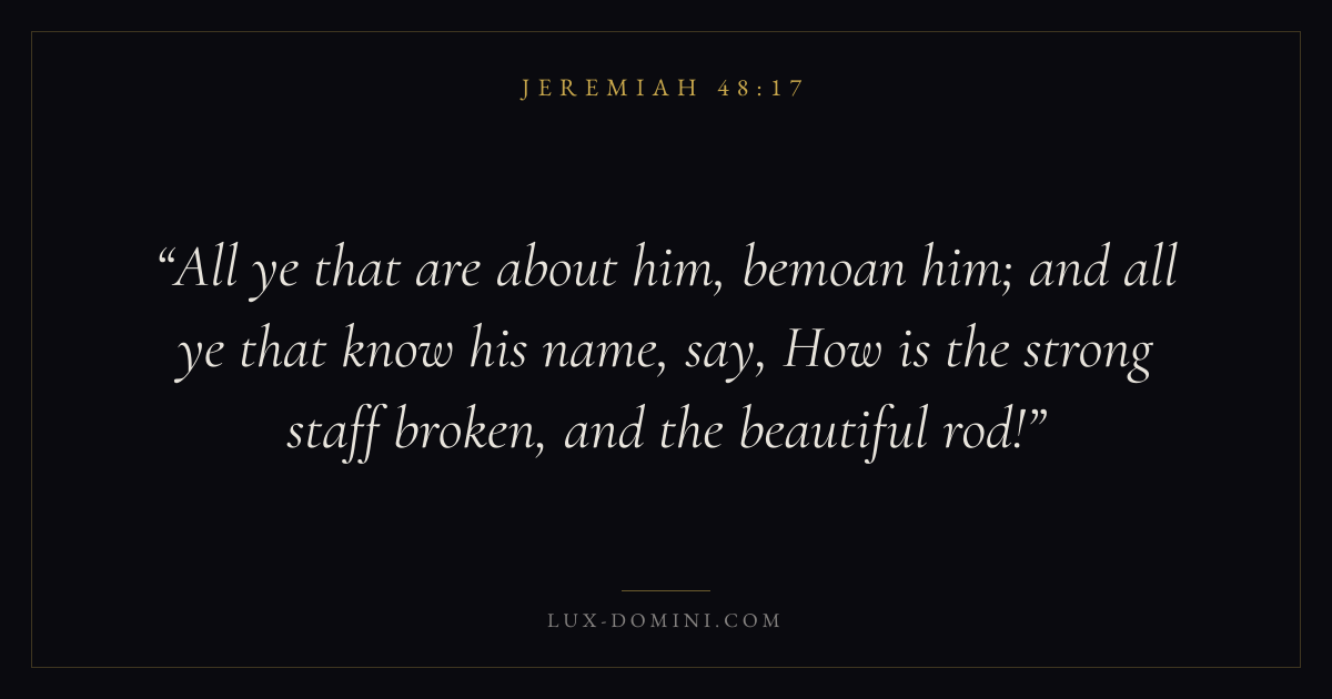 All ye that are about him, bemoan him; and all ye that know his name, say, How is the strong staff broken, and the beautiful rod!