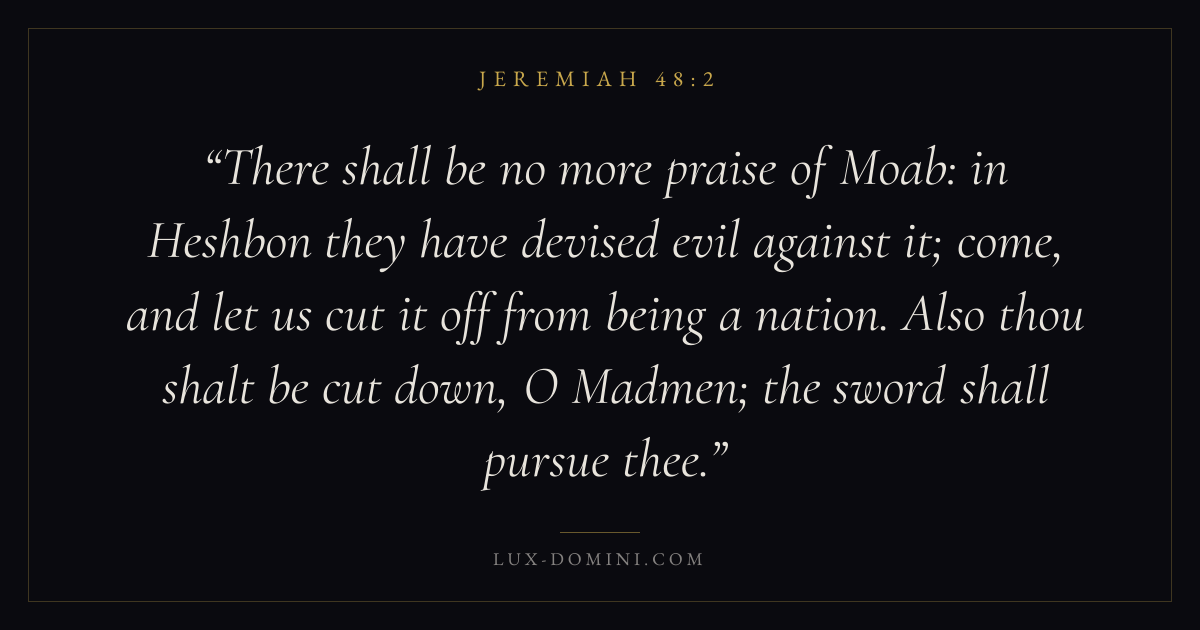 There shall be no more praise of Moab: in Heshbon they have devised evil against it; come, and let us cut it off from being a nation. Also thou shalt be cut down, O Madmen; the sword shall pursue thee.