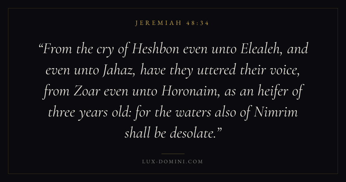 From the cry of Heshbon even unto Elealeh, and even unto Jahaz, have they uttered their voice, from Zoar even unto Horonaim, as an heifer of three years old: for the waters also of Nimrim shall be desolate.